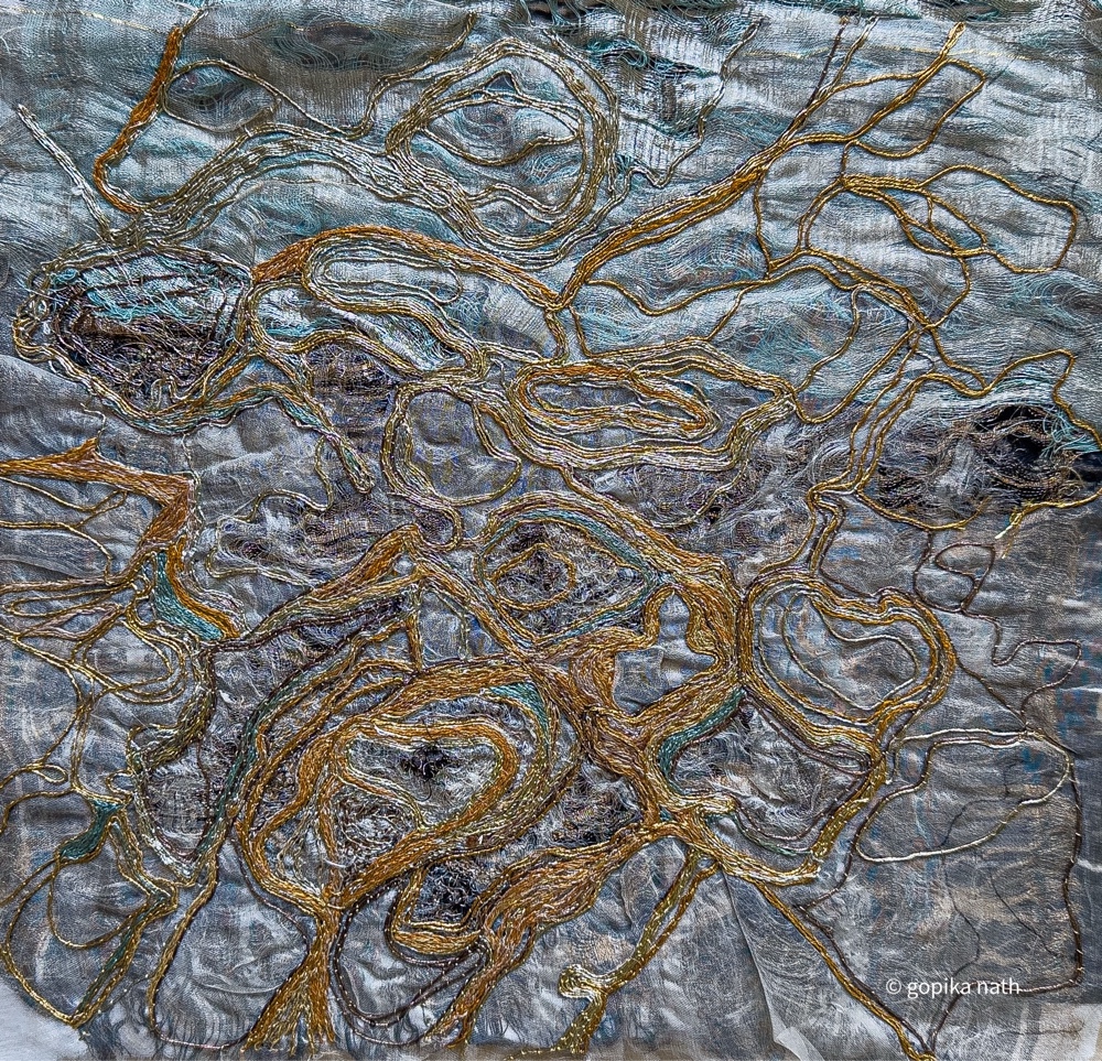 I continued with couching the six-ply zari thread. It has a rhythm to it. You hold the thread to be couched, and you keep the fabric taut, holding the laid thread close. Because I’m couching large, uneven spaces I don’t use a hoop. Both hands work in tandem as if dialoguing with each other. Left hand thumb and index finger over the thread to be couched, keeping it in place. Other three fingers below the fabric, keeping it close to the laid thread—light pressure from top and bottom. Right hand, holds the needle between thumb and index finger, little finger and side of hand, over the thread— when it’s slack, keeping the tension-mild but keeping thread straight to avoid the knots. I’ve tried using a hoop but it interrupts the rhythm of long laid threads to be couched. Yes, the laid thread may pucker a bit, but that’s okay because the inspiration, for this piece and others in the series, is sun glinting off ripples of water.