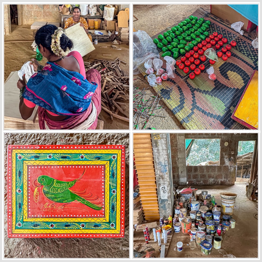 I left early. I had time. I stopped at the Sawantwadi Palace, asked for directions while having a cold coffee, then followed the route I was given. I parked the car just below the aali and walked up. The market rose on a hill, a fairly steep climb, lined with all kinds of wares being sold along the way. At the top, I turned right and found a couple of small shops selling wooden toys, painted objects, and familiar Chitari forms.