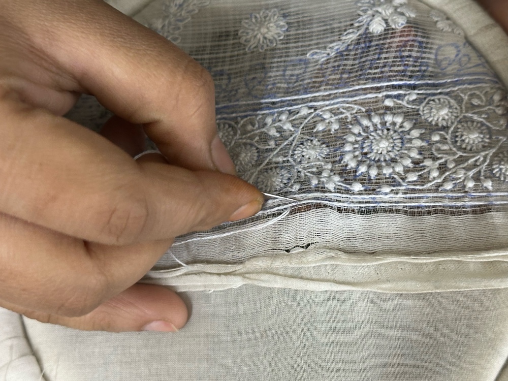 This, reminded me of my visit to Lucknow last April, learning from women engaged in chikankari. Here the context is different, and is not intended as a historical parallel. These were largely Muslim women, many of whom were not permitted to move freely outside the home. They arrived at the atelier covered from head to toe—stepping in wearing burqas, and then, once inside this all-women’s space, unveiled and stitched through the day. The workroom became a contained world — sanctioned, protected, but bounded. Stitch did not alter the structures that governed their lives. It did not offer emancipation. What it offered was time, focus, and a place to speak, share and where attention could rest. Listening to them, and later transcribing those conversations, I was struck by how often stitching appeared not as aspiration or expression, but as continuity — a way of remaining intact within conditions that were unlikely to change.